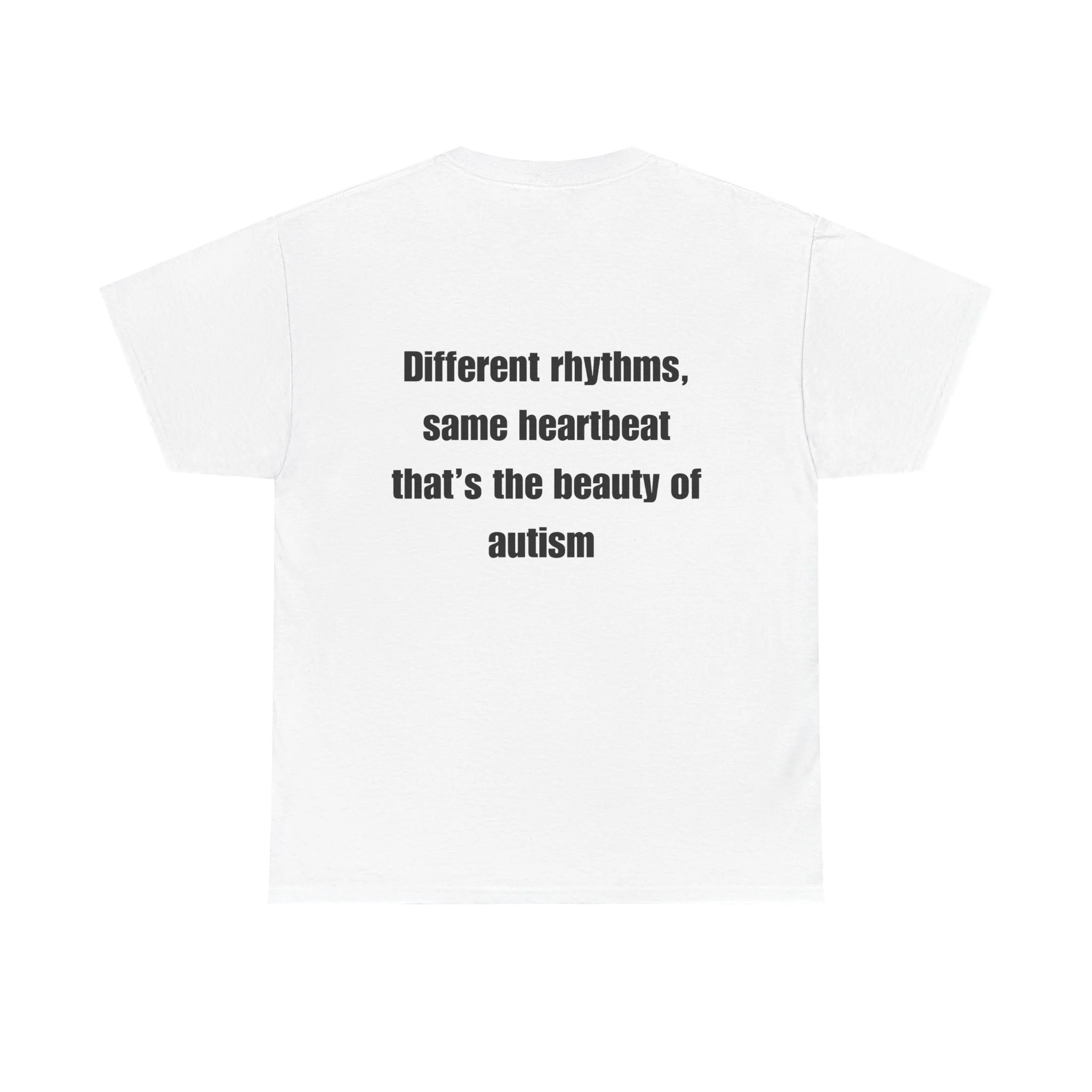 Autism Awareness T-Shirt — Infinity Puzzle Heart Design with "Different rhythms, same heartbeat"